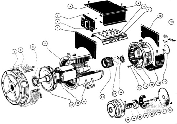 1—前端盖;2—出风盖板;3—轴承;4—定子;5—端子箱侧板;6—电压调节器;7—调节器支架;8—端子箱顶盖;9—端子箱前后板;10—接线板;11—接线板支架;12—端子箱侧板;13—吊攀;14—轴承盖;15—进风盖板;16—后端盖;17—励磁定子;18—励磁定子固定螺栓;19—轴承;20—旋转整流器;21—励磁电枢;22—接地牌;23—转子;24—风扇;25—永磁机机壳;26—永磁机转轴;27—永磁机转子;28—永磁机定子;29—永磁机定子固定螺栓;30—永磁机转子固定螺栓;31—垫圈;32—永磁机盖板